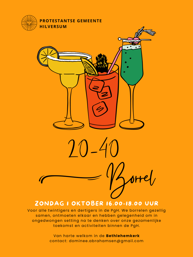De 20+groep nodigt leeftijdsgenoten van harte uit voor een borrel op zondag 1 oktober in de Bethlehemkerk. ‘Ben jij een twintiger of dertiger en op zoek naar geloofsgenoten in de kerk? Kom dan gezellig naar onze borrel’, luidt de oproep. Van 16u00 tot 18u00.