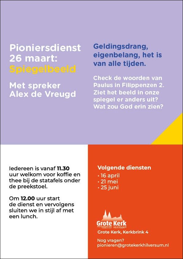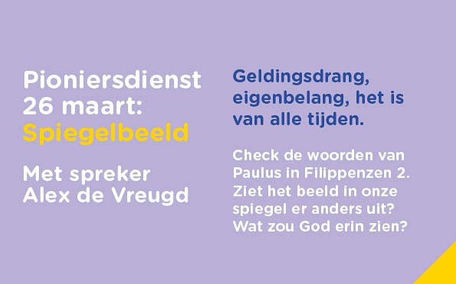 Over de komende pioniersdienst zeggen de organisatoren: ‘Het thema is ‘spiegelbeeld’. Check de woorden van Paulus in Filippenzen 2. Ziet het beeld in onze spiegel er anders uit? Wat zou God erin zien? Net als in de andere pioniersdiensten zal dat op een interactieve manier gebeuren. Iedereen is vanaf 11u30 welkom om rond de statafels onder de kansel koffie, thee en fris te drinken. Om 12.00 uur start dan de pioniersdienst en vervolgens sluiten we in stijl af met een lunch. Doe je mee?’