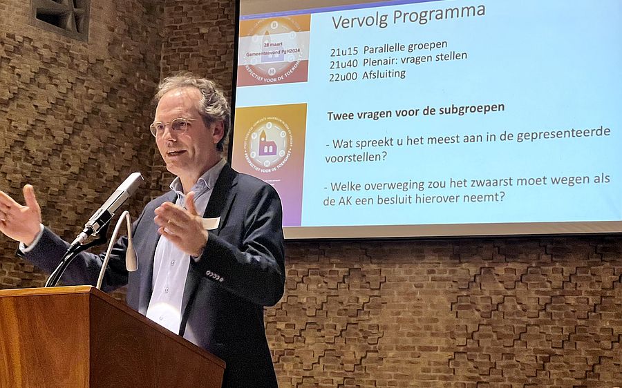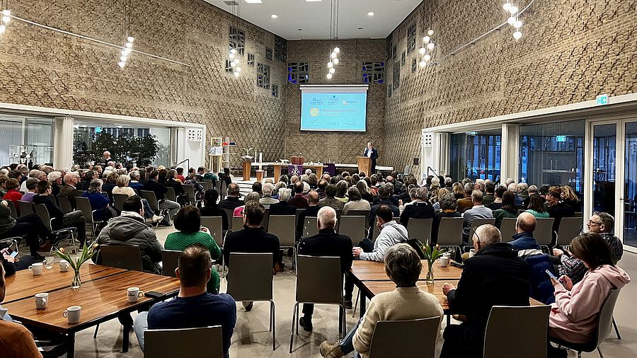‘Van deze avond word ik erg blij.’ Zo omschreef Jan de Leede zijn beleving bij de gemeenteavond over de nabije toekomst van de Protestantse Kerk in Hilversum. In de Bethlehemkerk kwamen op 28 maart circa 220 gemeenteleden bijeen om te luisteren naar adviezen over de toekomst van de kerk in Hilversum en om met elkaar daarover in gesprek te gaan. Jan de Leede, voorzitter van de Algemene kerkenraad, en radiopresentator en dominee Elsbeth Gruteke leidden de avond. Online namen ook mensen deel via 157 kijksessies.