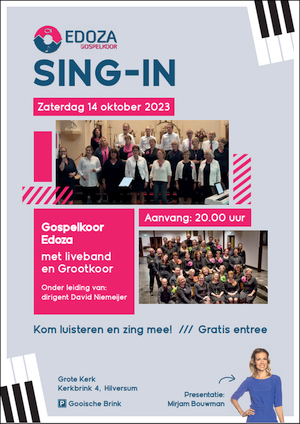Zaterdagavond 14 oktober vindt in de Grote Kerk om 20u00 uur de Sing-in plaats, georganiseerd door Gospelkoor Edoza. Een grote bijdrage wordt geleverd door een eenmalig Grootkoor waar ook een groot aantal gemeenteleden uit de diverse Hilversumse kerkgemeenschappen deel van uitmaken.