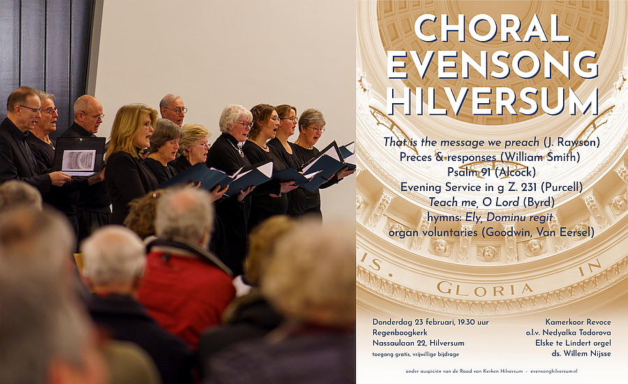 Tot en met 25 mei is er telkens op de vierde donderdag van de maand een choral evensong onder auspiciën van de Hilversumse Raad van kerken. Aanvang 19u30. Toegang vrij, collecte ter bestrijding van de onkosten na afloop.