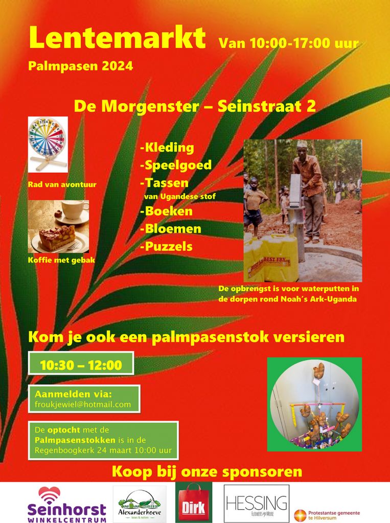 De Morgenster organiseert zaterdag 23 maart een lentemarkt. Er zijn diverse tafels met allerlei goede spullen als speelgoed, kleding, puzzels, tassen en schorten van Oegandese stoffen. Er is een boekenmarkt. Natuurlijk draait het rad van avontuur met mooie prijzen van onze sponsoren. Even uitrusten kan bij een kopje koffie of thee met iets lekkers.