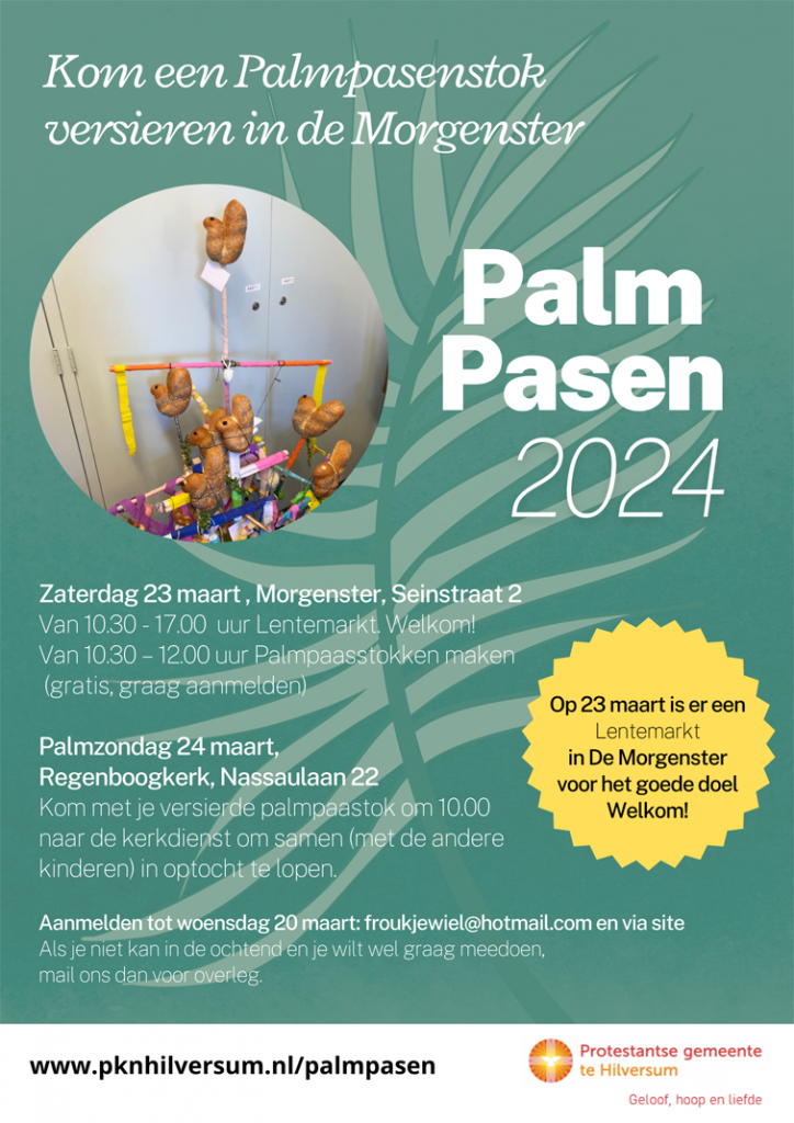 Zaterdag 23 maart, 10.30-12.00 uur, maken we de Palmpassstokken in De Morgenster, Seinstraat 2. Aanmelden is fijn, zodat we genoeg materialen hebben en je weet wat je mee moet nemen (stok/houten kruis zonder versiering). Aanmelden kan bij Froukje. Deze workshop is tegelijk met een Lentemarkt. Daar is natuurlijk iedereen welkom.