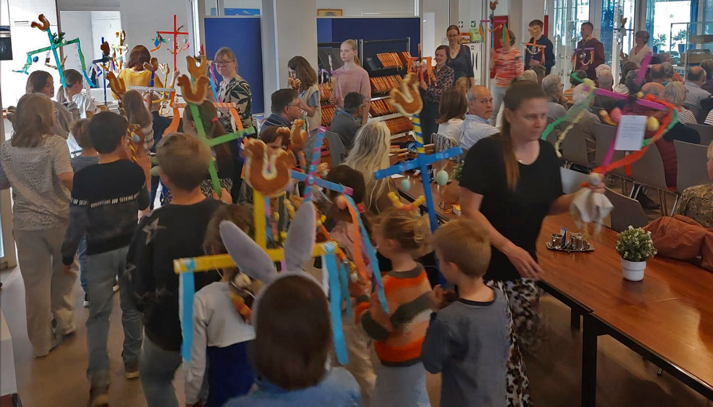 Dat zongen we zaterdag en zondag met de kinderen toen we het Palmpasenverhaal vertelden, en we samen gingen knutselen aan Palmpasenstokken. Op zaterdagmorgen deden we dat in De Morgenster, met 15 kinderen en hun ouders. Op zondagmorgen in de Bethlehemkerk was er een grote groep kinderen. Na het knutselen liepen we in een vrolijke stoet door de kerk heen. En daarna, tja, toen konden we ons niet meer inhouden en was het lekker snoepen!