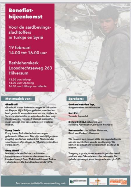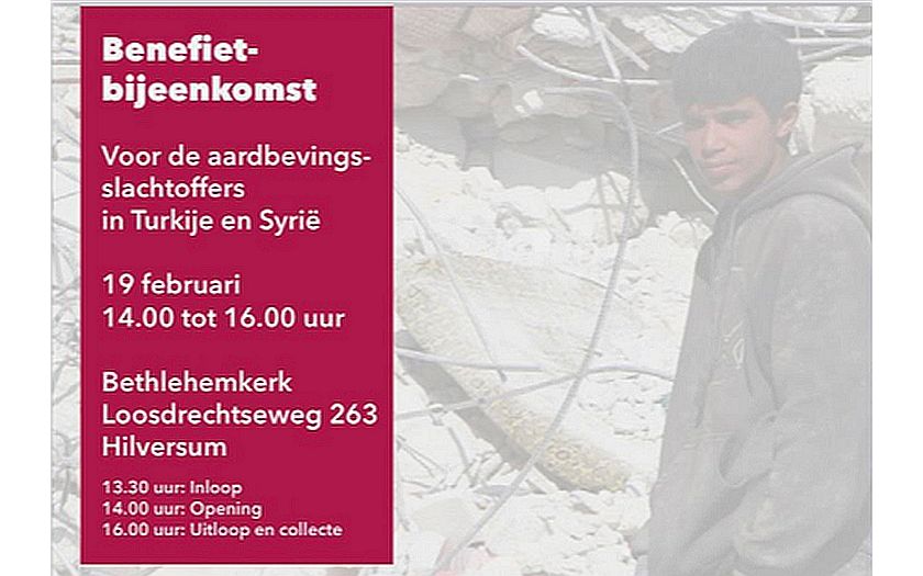 Een uniek gezelschap van artiesten en sprekers treedt aanstaande zondag op tijdens de grote Hilversumse benefiet voor de slachtoffers van de aardbevingen in Turkije en Syrië. De bijeenkomst is bedoeld om geld in te zamelen en samen te komen om met elkaar steun te bieden aan hen die door de vreselijke ramp zijn getroffen. De benefiet vindt plaats op 19 februari van 14u00 tot 16u00 in de Bethlehemkerk aan de Loosdrechtseweg 263 in Hilversum. De inloop is om 13u30.
