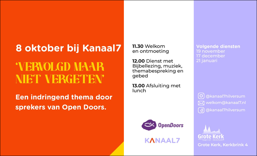 ‘Vervolgd maar niet vergeten’. Dat is het thema van de jongerendienst – Kanaal 7 – in de Grote Kerk op zondag 8 oktober om 11u30. Mensen van Open Doors komen vertellen over hun werk. Open Doors steunt christenen die om hun geloof worden vervolgd of verdrukt. De organisatie brengt Bijbels en christelijke lectuur naar landen die daarvoor gesloten zijn. Daarnaast geeft Open Doors training en verleent de organisatie praktische hulp, zoals traumazorg en noodhulp.