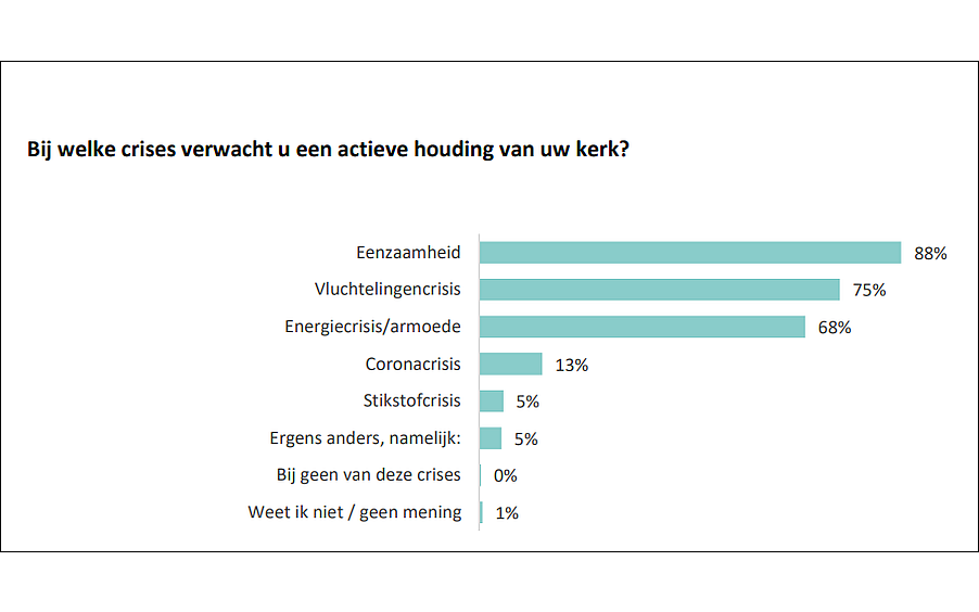 Actie van de kerk wordt vooral verwacht bij crises met een directe impact op het dagelijks leven. Naast de eenzaamheidscrisis verwachten kerkleden actie van de kerk als het gaat om de vluchtelingencrisis (75%) en de energie/armoedecrisis (68%). Bij de stikstof- en de coronacrisis verwachten kerkleden daarentegen in zeer beperkte mate een actieve rol van hun kerk.