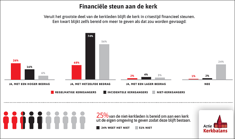 Iedereen wordt geraakt door de verschillende crises, ook kerkgangers. Toch blijft veruit het grootste deel van de kerkleden de kerk in tijden van crises financieel steunen (94%). Bijna een kwart van de mensen is zelfs bereid meer te geven (21%). Ook de meeste kerkleden die niet naar de kerk gaan, blijven de kerk steunen (56%). Een kwart van deze groep geeft aan de kerk in deze tijden niet (meer) financieel te steunen. Opvallend is ook dat een kwart van de respondenten die helemaal geen lid zijn van een christelijke kerk, toch bereid zijn aan een kerkgenootschap in de buurt te geven.