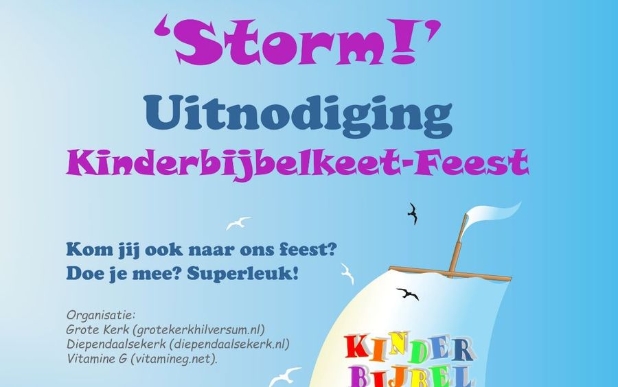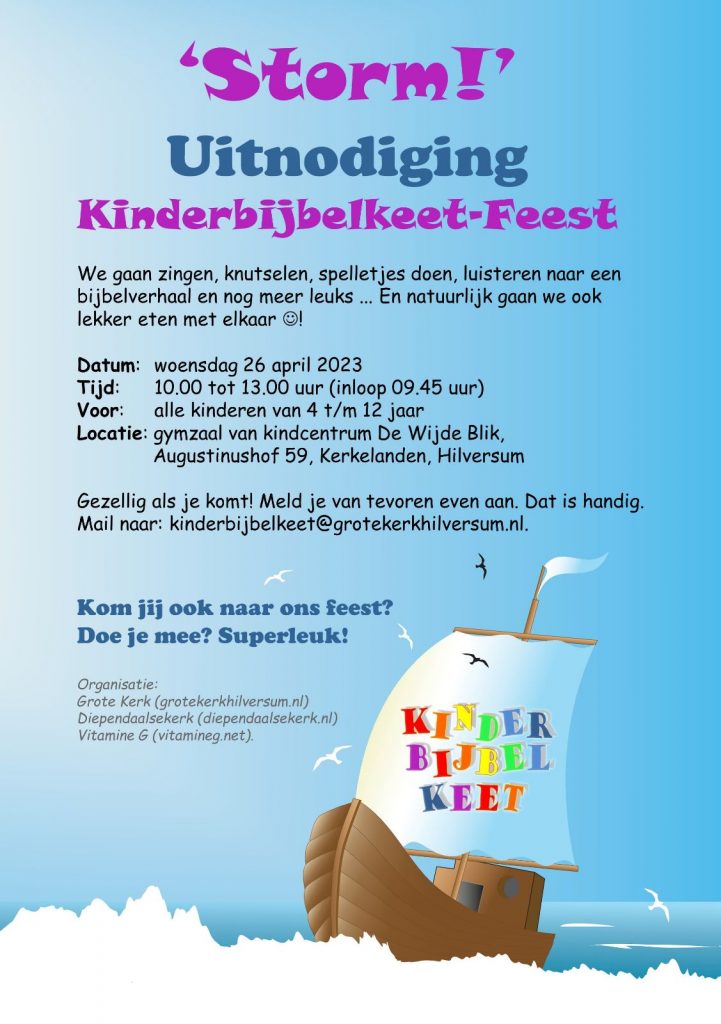 Op woensdag 26 april is er weer een Kinderbijbelkeet-feest. Dit keer met het thema: ‘Storm’. Knutselen, zingen, spelletjes, een Bijbelverhaal en lekker eten. Alle kinderen van 4-12 jaar zijn welkom, dus ook vriendjes en vriendinnetjes.