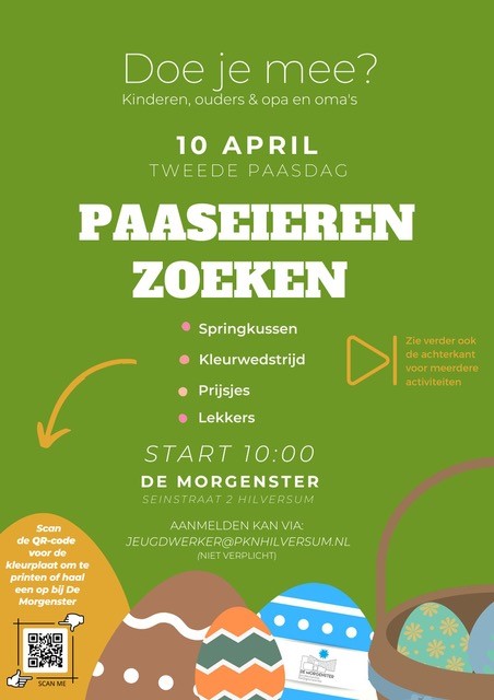 Tweede Paasdag, 10 april, is het ‘paaseieren zoeken’ geblazen rond De Morgenster. De start is om 10u00. Daarnaast is er ook een kleurwedstrijd en een springkussen. Kortom, alle kinderen en natuurlijk iedereen jong van hart van harte welkom.