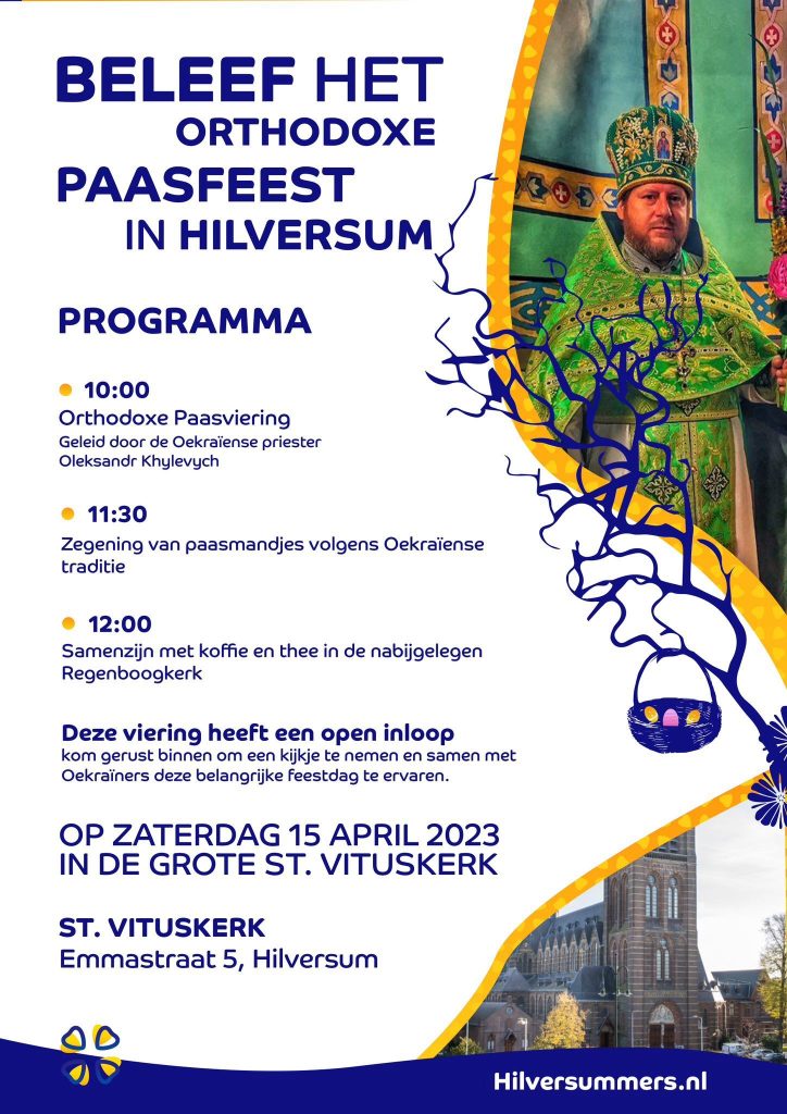 Op zondag 16 april vieren de Orthodoxe kerken het Paasfeest. In de Vituskerk aan de Emmastraat in Hilversum is er op de zaterdag voorafgaand, 15 april, om 10u00 een Orthodoxe Paasviering. Voorganger is Oleksandr Khylevych, Oekraïens priester.