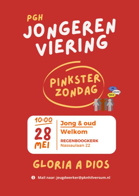 Op Pinksterzondag 28 mei is de laatste PgH-jongerenviering van het seizoen. Om 10u00. En deze keer in de Regenboogkerk. Thema: ‘Gloria A Dios’.