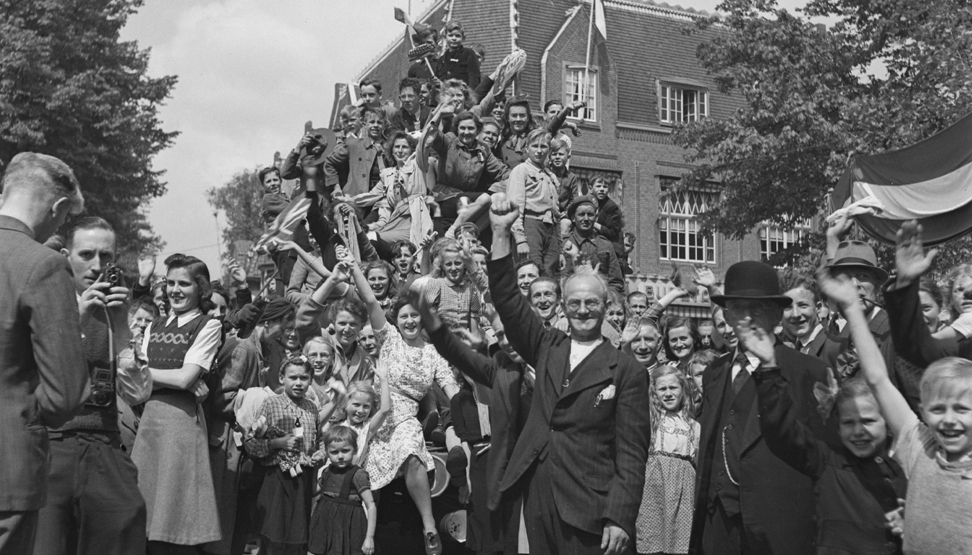 Beeld: Vreugde in Hilversum Een geallieerd legervoertuig bedolven onder toeschouwers.