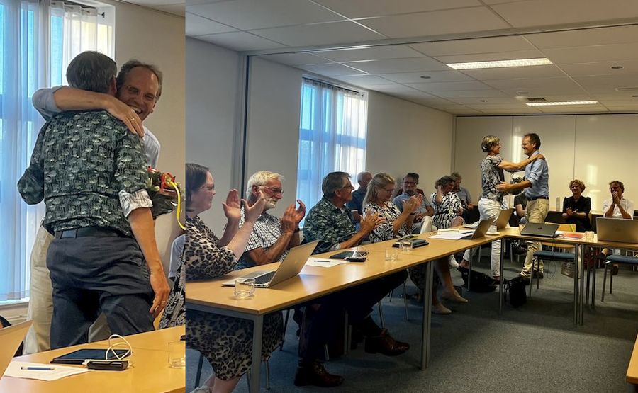 Op maandagavond 26 juni namen twee ‘oud-gedienden’ afscheid als lid van de Algemene kerkenraad. Voorzitter Jan de Leede sprak Marya de Haas en Erik van Halsema toe, leden die ‘telkens het belang van Protestants Hilversum voor ogen hielden.’