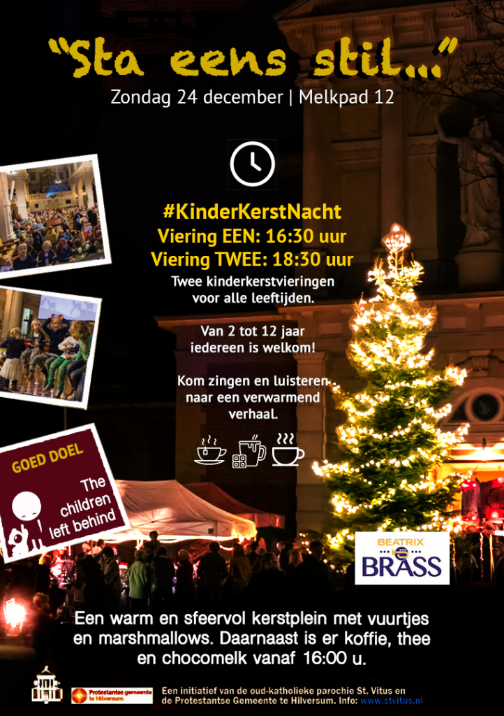 Op kerstavond, 24 december, zijn in de St. Vitus aan het Melkpad twee kerstnachtvieringen voor kinderen. Dominee Aster Abrahamsen en Fokko Bosker zijn bij de voorbereidingen betrokken. Zij laten weten: ‘Aangezien 24 december op een zondag is, hebben we besloten dat de eerste kinderdienst start om 16u30. De tweede om 18u30. De kinderkerstnachtvieringen worden geleid door pastoor Tjeerd Visser en ds. Aster Abrahamsen’.