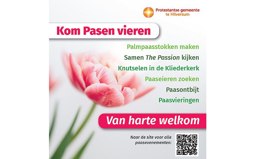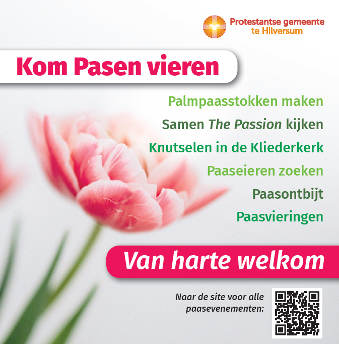 Donderdag 30 maart verscheen in de Gooi en Eembode een uitnodiging om deel te nemen aan Paasactiviteiten in de Protestantse gemeente Hilversum. In de verschillende PgH-kerken is het mogelijk de voorbereiding op Pasen mee te maken en het Paasfeest mee te vieren. De qr-code leidt naar pagina Pasen 2023.