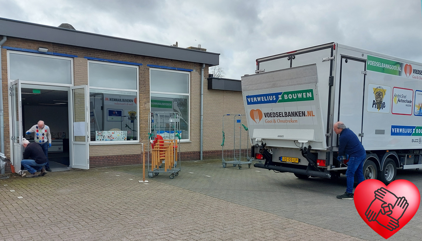 Iedere donderdag zijn de vrijwilligers al vroeg op de Oosterengweg. De vrachtwagen brengt vanuit Huizen nieuwe producten. De vrijwilligers leggen ze in de schappen, zodat de cliënten straks hun mandje kunnen vullen. Als alles klaar staat, drinken ze nog even een kopje koffie.