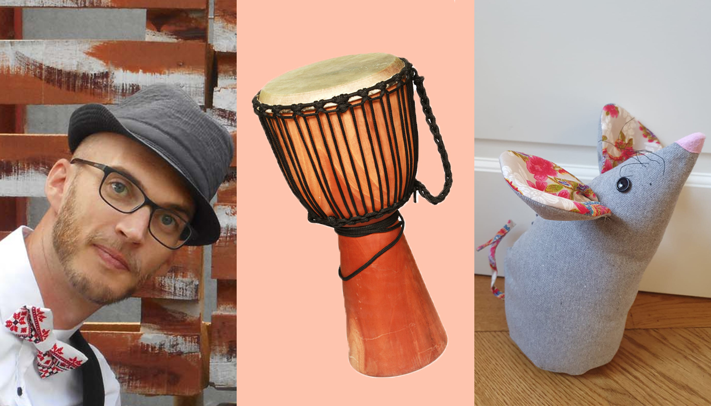 Tony vertelt erover voordat de workshops beginnen. Je kunt kiezen uit twee workshops: een deurstopper maken (muis of peer) of djembé spelen met Tony. De opbrengst van de workshop komt ten goede aan dit project.