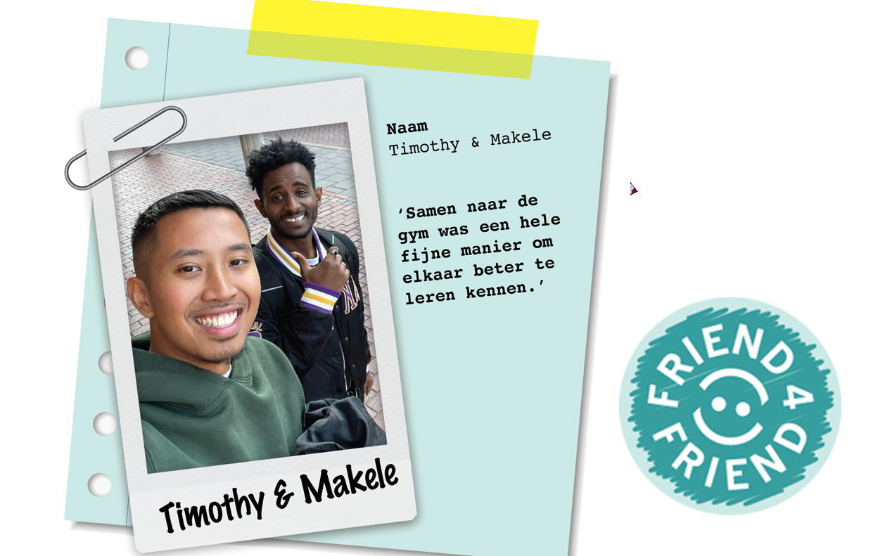 Kerst 2022 vertelden Makele en Timothy over hun ontmoetingen en sportieve vrijwilligerswerk in Kerkbrink. Makele leerde meer over Nederland en kon zijn Nederlands oefenen bij de voetbaltrainingen: “Eerst was ik een beetje bang. Maar nu durf ik Nederlands te praten tegen de kinderen. Nu is het beter. Ik heb geleerd dat ik sterker kan worden. Door Timothy ben ik sterker geworden”. Voor Timothy was Friend4Friend ook een stage voor de opleiding Social Work.